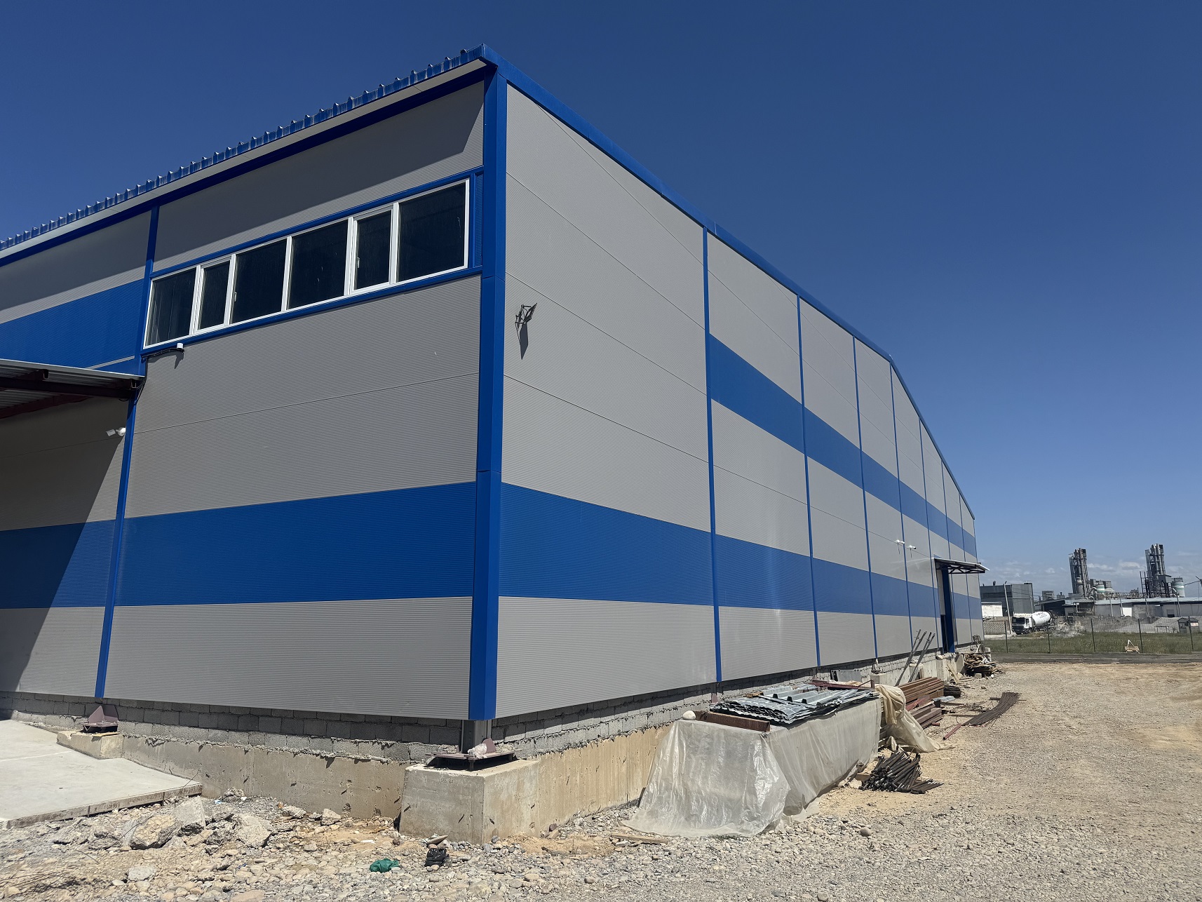 В соответствии с дизайном проекта, с внешней стороны стеновые сэндвич-панели изготовлены в сигнальном сером цвете RAL 7004 и сигнальном синем RAL 5005. C внутренней стороны – в сигнальном белом цвете RAL 9003.