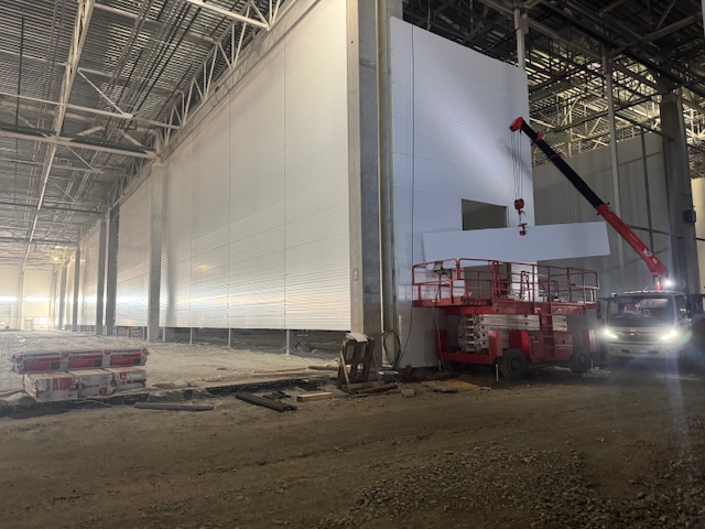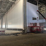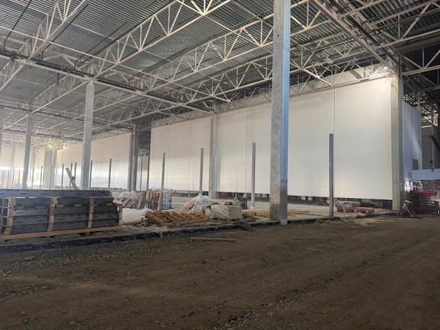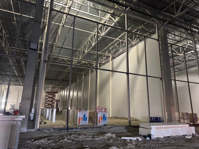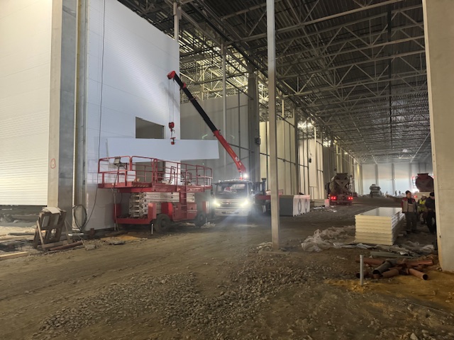 Сэндвич-панели изготовлены в сигнальном белом цвете RAL 9003 c обеих сторон. Для внешнего контура использовались сэндвич-панели толщиной 100 мм, для внутренних стен – сэндвич-панели толщиной 120 и 150 мм.