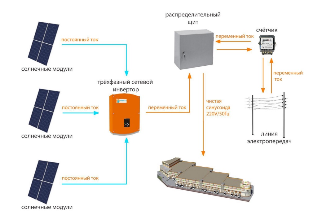- все необходимое оборудование для подключения солнечной станции к сети переменного тока 220 или 380 В