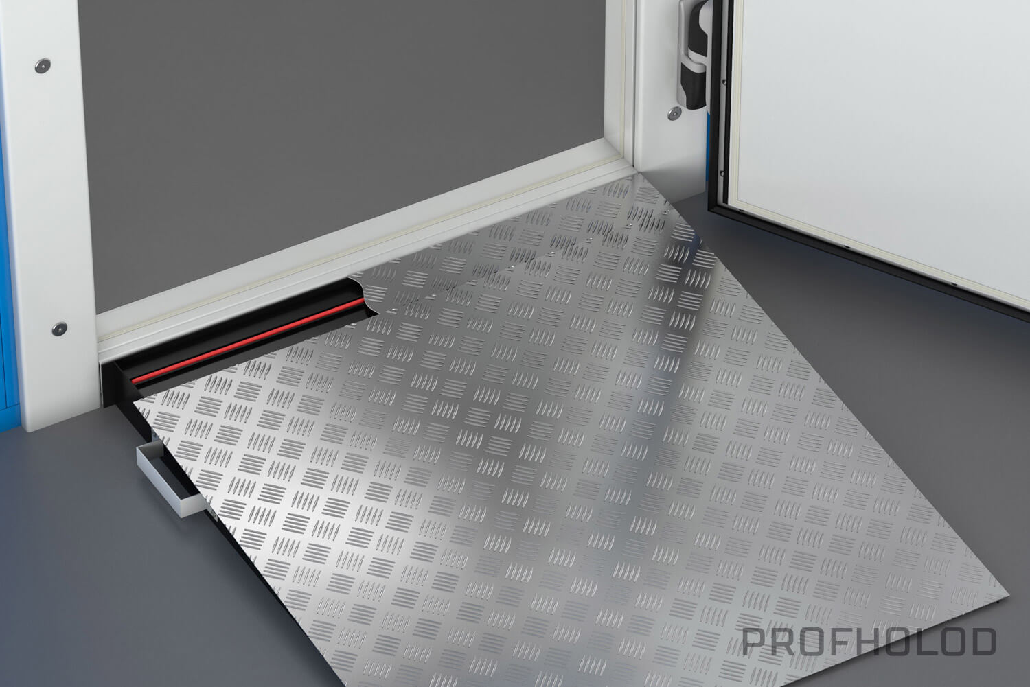 ПрофХолод производит пандусы двух типов: стационарный и накладной. Стационарный пандус устанавливается к дверям с безпороговой рамой. Накладной пандус оборудован дополнительными ручками, для удобства перемещения. В безпороговых низкотемпературных дверях в пандус монтируется ПЭН 40 Вт/м для предотвращения промерзания нижнего уплотнителя к снованию пандуса.Стандартная глубина пандуса: 1000 мм