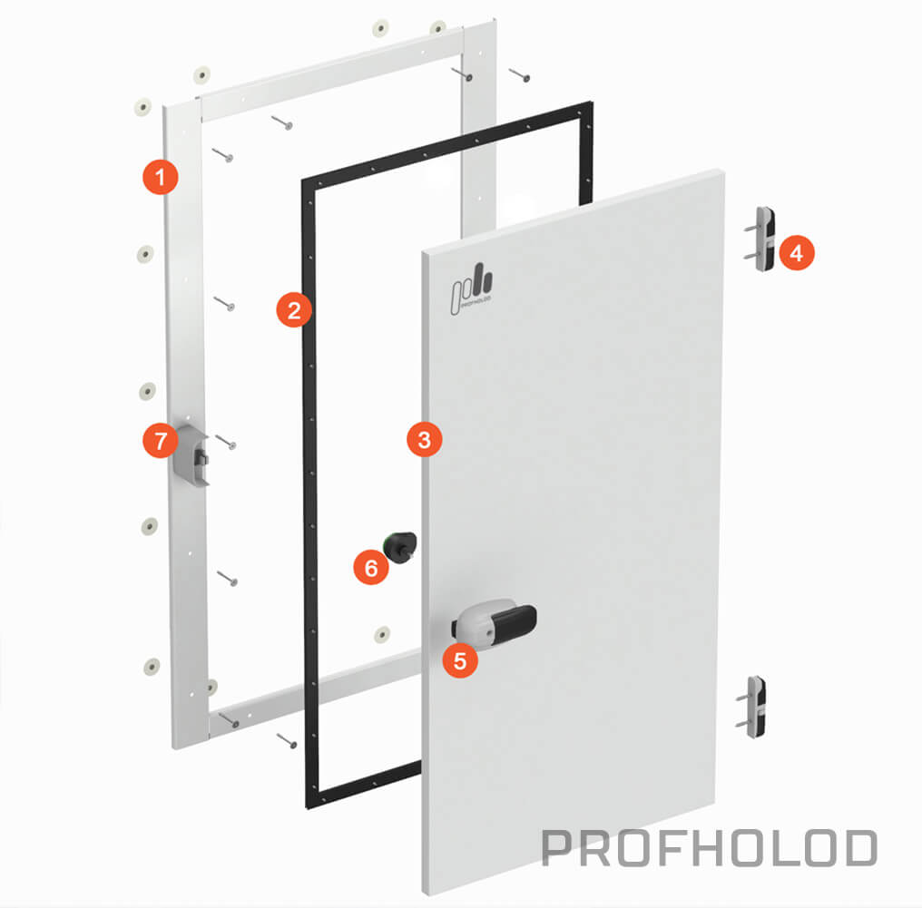 Конструкция производится для двух размеров световых проемов: шириной 800 или 900 мм и высотой до 2200 мм. Длина стеновой панели определяется высотой холодильной камеры. Дверная рама крепится к панели с помощью стандартного комплекта крепления: гайка Эриксона, металлическая шпилька, термошайба и термогайка.