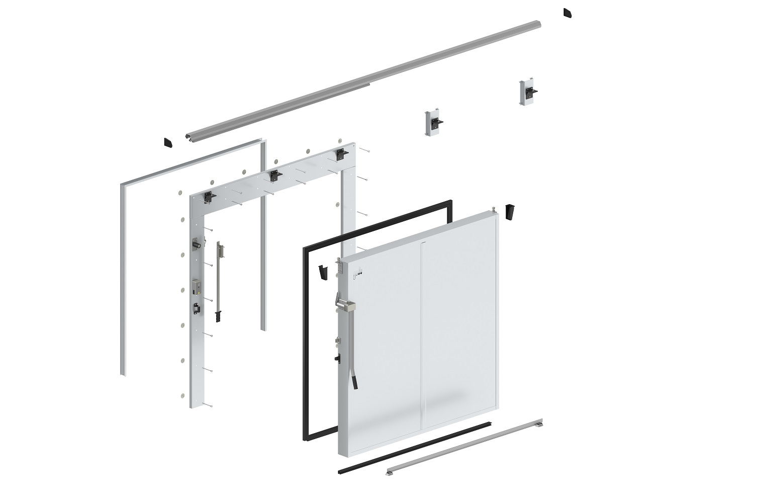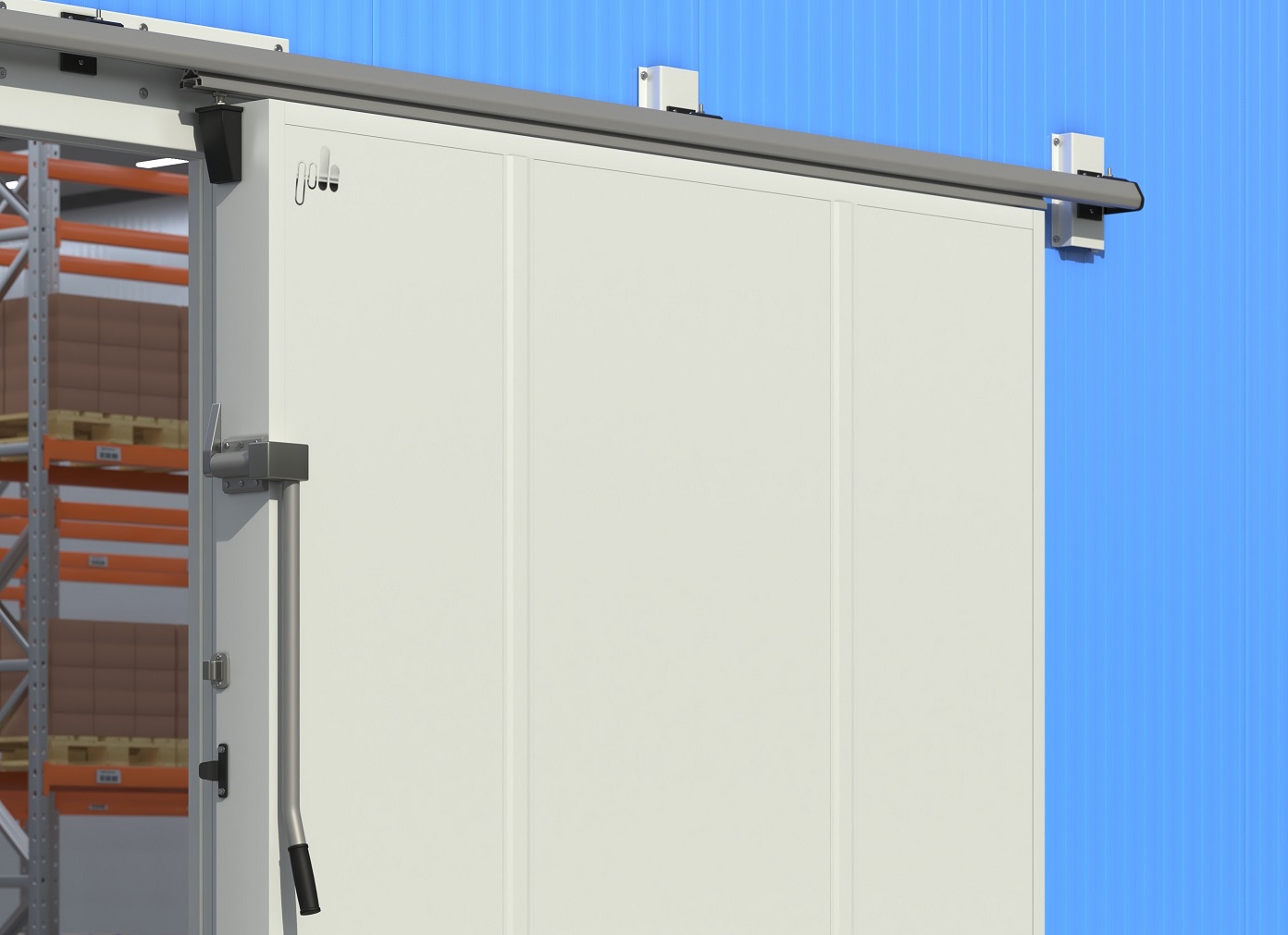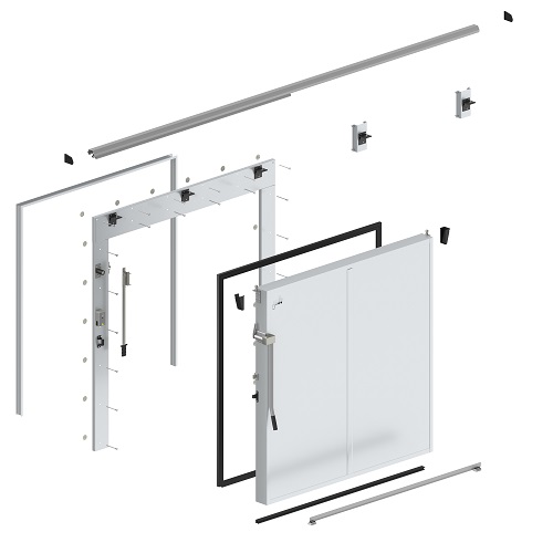 Откатные ворота для холодильной камеры и склада комплектуются исключительно металлической фурнитурой «тяжелой серии» фирмы Fermod (Франция) и фурнитурой собственного производства «ПрофХолода».