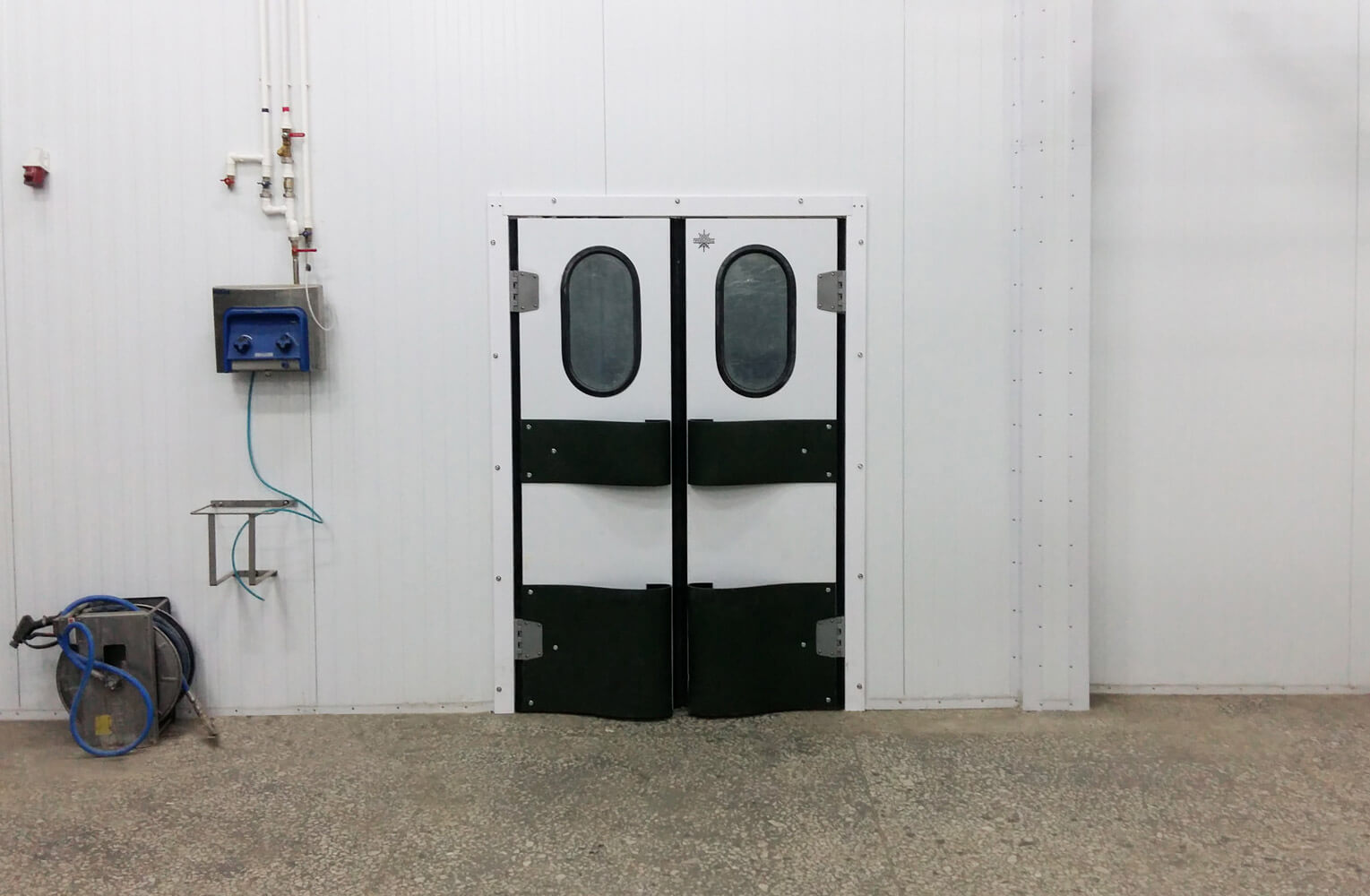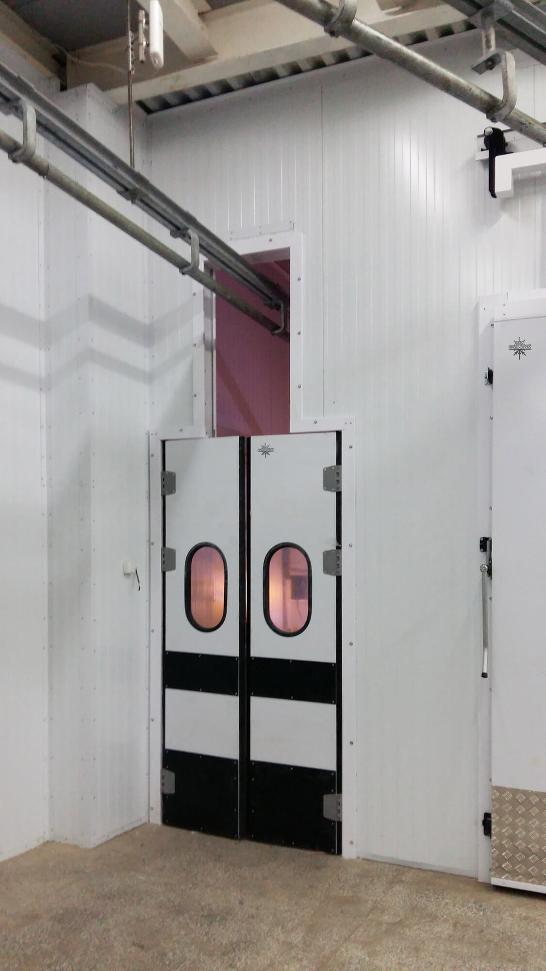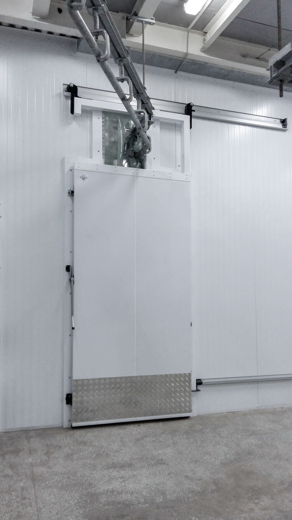 Маятниковые и откатные двери «ПрофХолод» выполнены с проемом под монорельс для транспортировки крупногабаритной продукции.