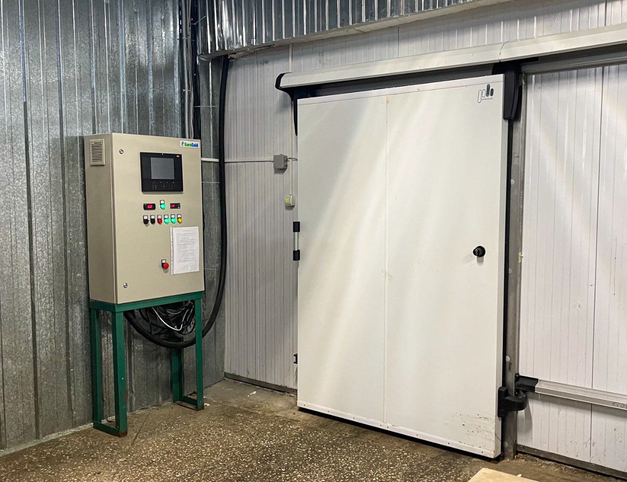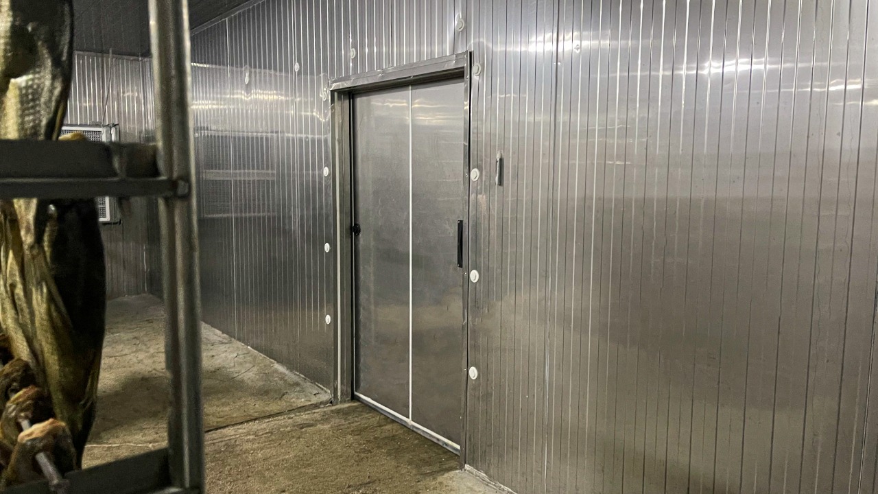 Для строительства сушильной камеры на рыбном производстве в Алматинской области, Казахстан, «ПрофХолод» произвел и поставил стеновые сэндвич-панели с PIR Premier и откатную холодильную дверь.