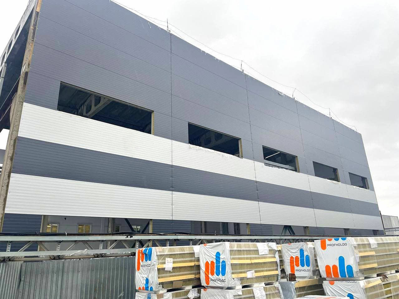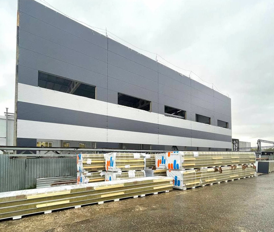 Для строительства производственного здания «ПрофХолод» произвел более 1 500 кв. м стеновых и 1 000 кв. м кровельных сэндвич-панелей с минеральной ватой, цвет 9003 и 9006.