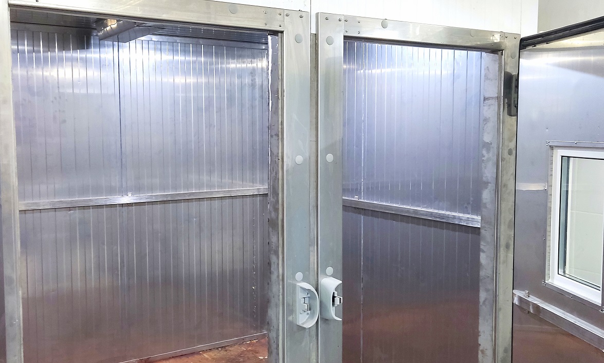 «ПрофХолод» произвел 31 кв. м сэндвич-панелей с PIR Premier толщиной 80 мм и две РДОП с двумя видами покрытия: металл с полиэфирной краской RAL 9003 с наружной стороны, пищевая нержавеющая сталь AISI 304 – c внутренней. За счет такого решения заказчику удалось уменьшить стоимость сэндвич-панелей и дверей.