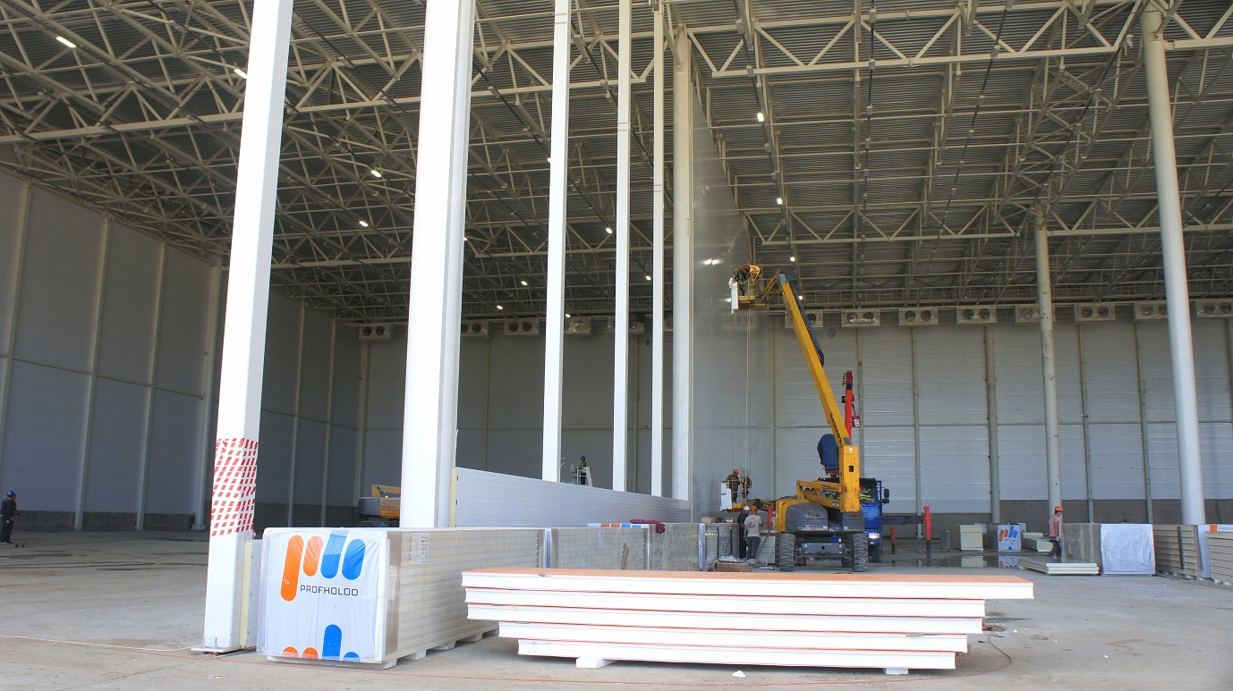 Для строительства склада общей площадью более 15 000 кв. м с площадью морозильных камер более 13 000 кв. м «ПрофХолод» произвел более 13 000 кв. м стеновых сэндвич-панелей с утеплителем PIR Premier, более 2 000 кв. м сэндвич-панелей с утеплителем из минеральной ваты, фасонные элементы.