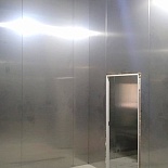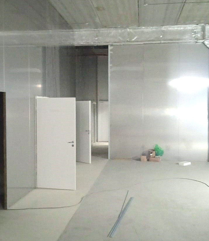 Из-за высоких требований к пожарной безопасности объекта были выбраны сэндвич-панели с утеплителем из минеральной ваты. Так как особого утепления не требовалось, для данного объекта было достаточно толщины 50 мм. Предел огнестойкости El 30. Учитывая назначение помещения, сэндвич-панели изготовлены с покрытием из нержавеющей стали для пищевых продуктов AISI 304 с обеих сторон.