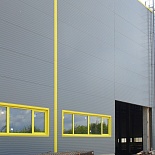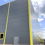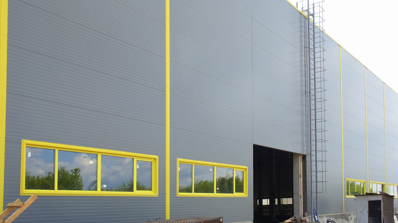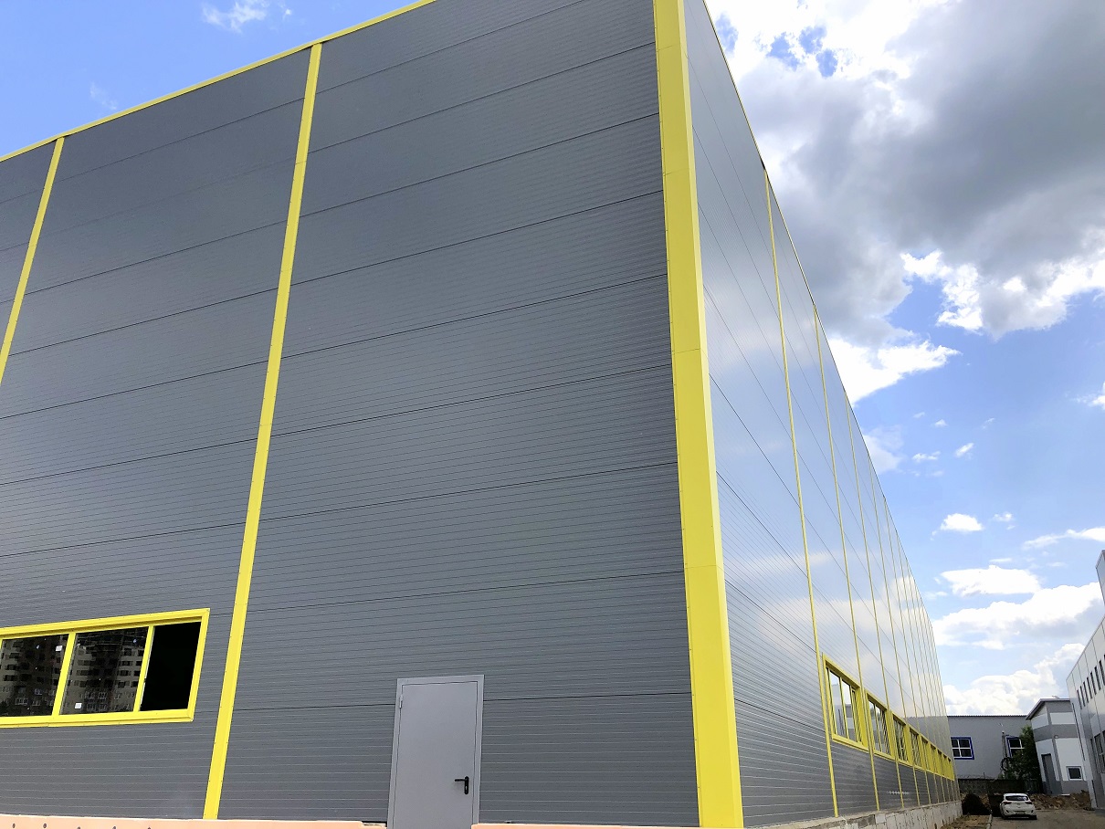 В соответствии с дизайном проекта для одного здания сэндвич-панели изготовлены в немарком графитовом сером цвете RAL 7024 с внешней стороны. Ярким акцентом фасада стали желтые фасонные элементы, которые в сочетании с серыми сэндвич-панелями придали зданию оригинальный и выразительный внешний вид. Такое решение позволило создать уникальный дизайн здания, не переплачивая за нестандартный цвет сэндвич-панелей.