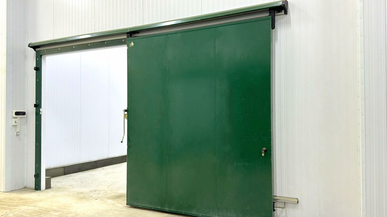 Фруктохранилище также оснастили 10 откатными холодильными дверями «ПрофХолода». Откатные двери оснащены усиленной фурнитурой собственного производства «ПрофХолод». Срок службы особо прочной фурнитуры «ПрофХолода» увеличен в 1,5 раза за счет модернизации элементов. С внешней стороны двери изготовлены в нестандартном темно-зеленом цвете «зеленый мох» RAL 6005, с внутренней стороны – в стандартном белом цвете RAL 9003. Применив разные цвета для разных сторон холодильных дверей, заказчик учел требования дизайна и избежал лишних трат на нестандартные цвета там, где в них нет необходимости.
